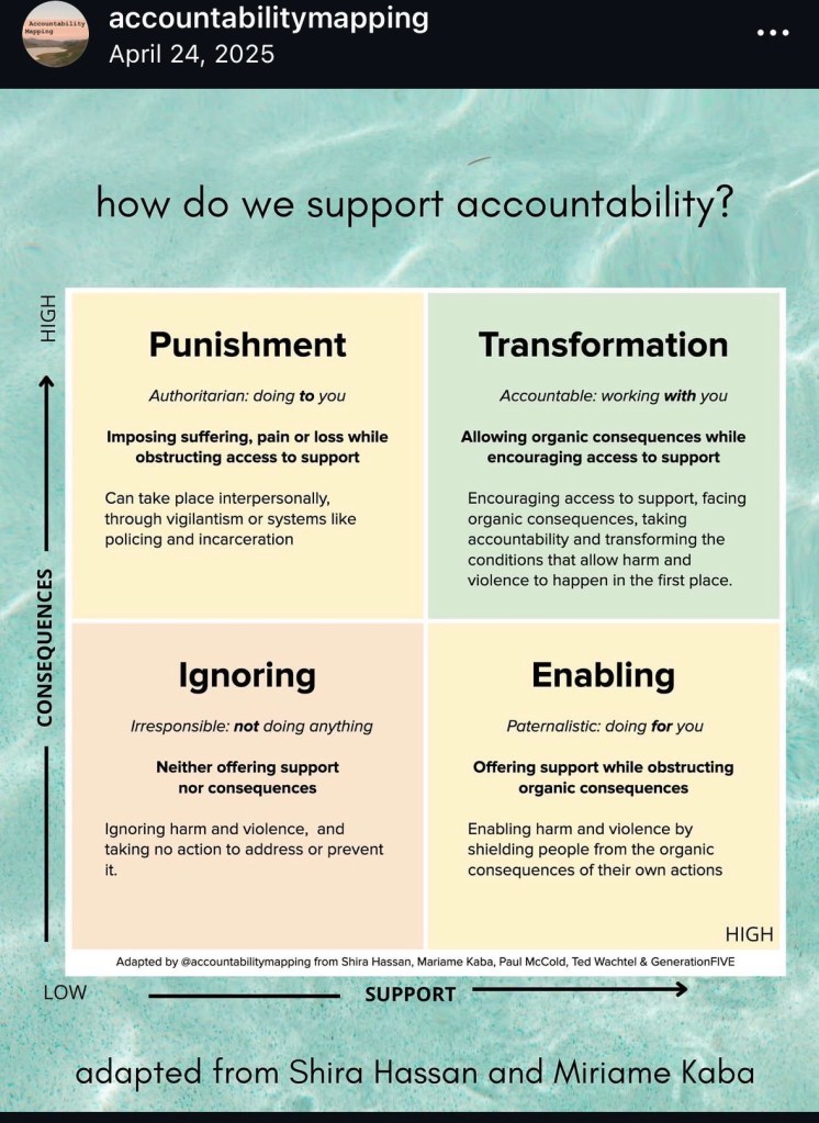 if I had the capacity I would lean into creating more resources to educate folks on the accountability process bc I do Not think folks were Taught how to feel / how to Be honest with themSelves re: causing harm n repairing it