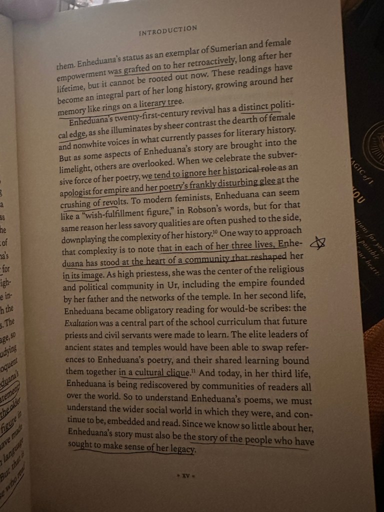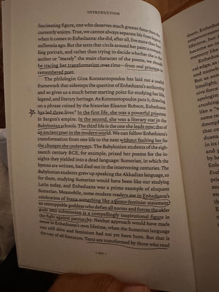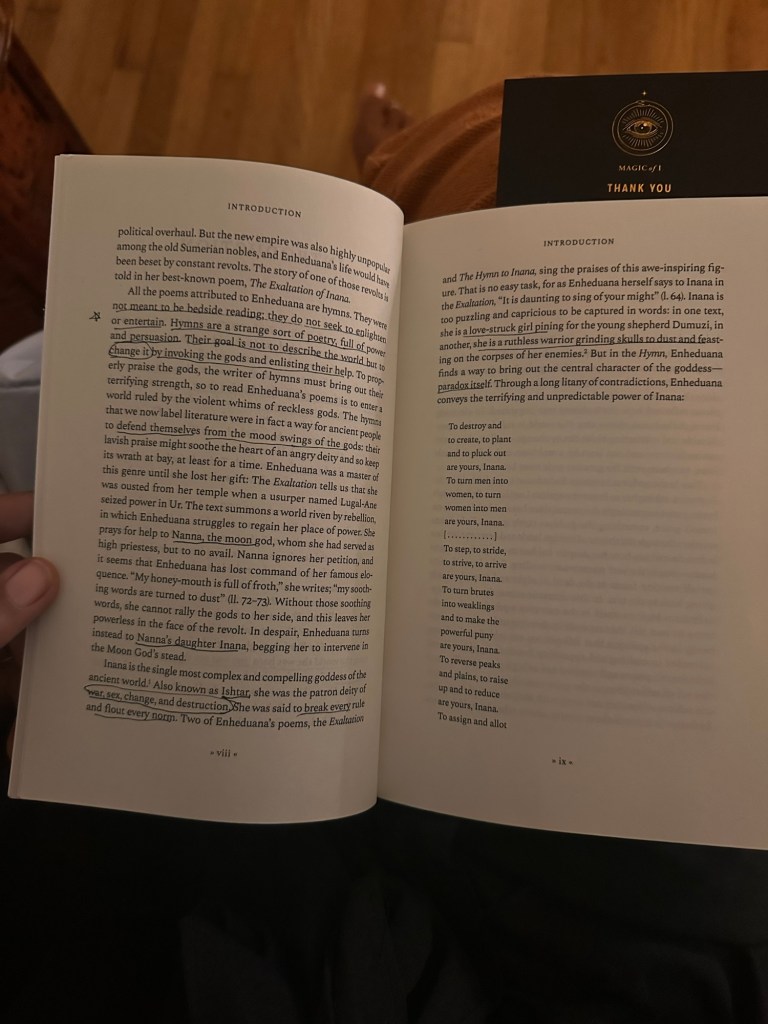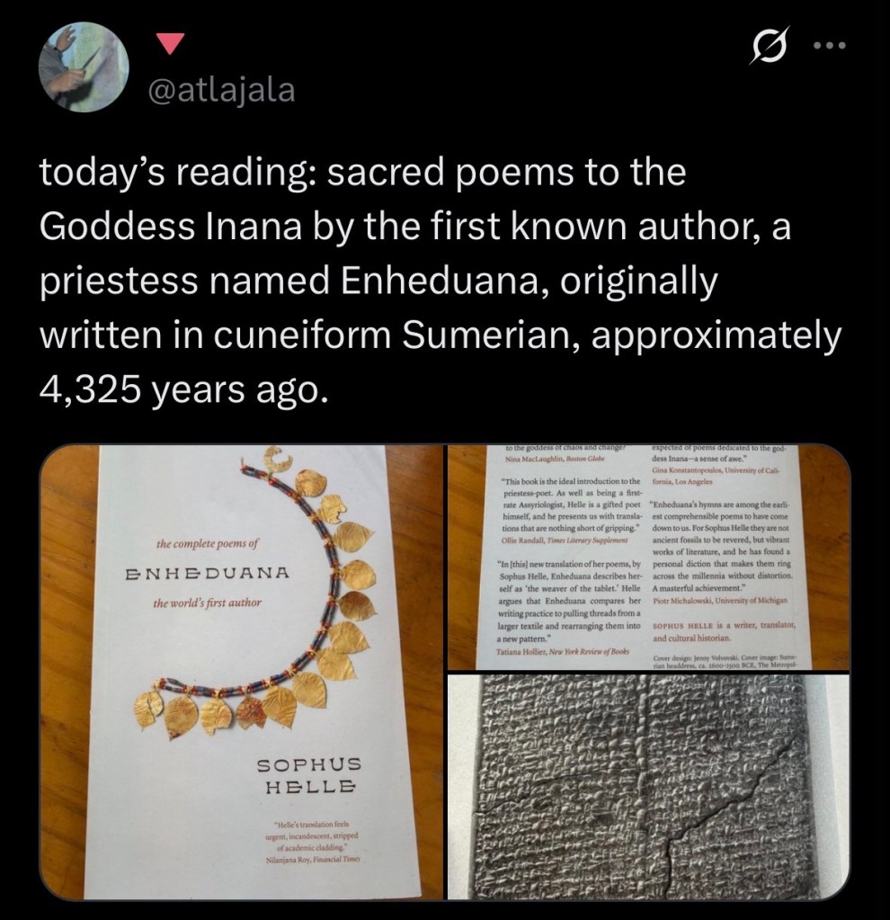 current read 📖 I started working with the deity / archetype Inanna when I met Aunties n friends (Chiqui) @/theloveofganeshasf around 2016/2017 n She Changed my Life n empowered me as a survivor to heal n take up space (n to avoid the depths of the Spiritual bypassing era of grifting n Love n Lighting) 🙇🏽 more n more original cuneiform poetry has resurfaced from the Earth in the Time since n it was affirming to stumble on this 2023 publication acknowledging one of Her first disciples Enheduana as the worlds first ever author ✍🏽 (re)creating a feminine Timeline of authorship